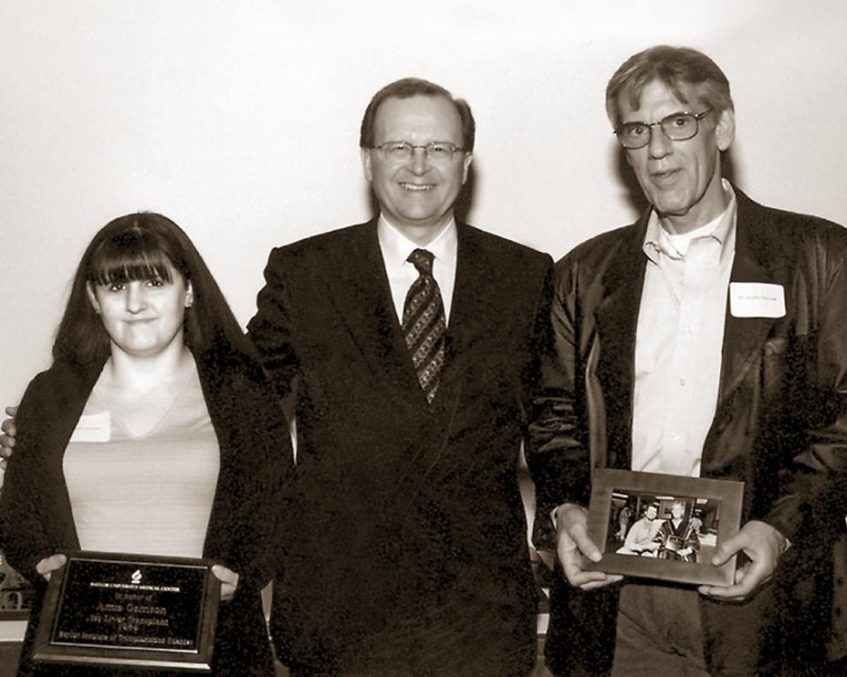 Dr. Goran Klintmalm (center) is pictured with Amie Garrison, who at age four received Baylor University Medical Center's first liver transplant in 1984, and Bradley Bower, Baylor Dallas' 2,000th liver transplant patient, 2002.