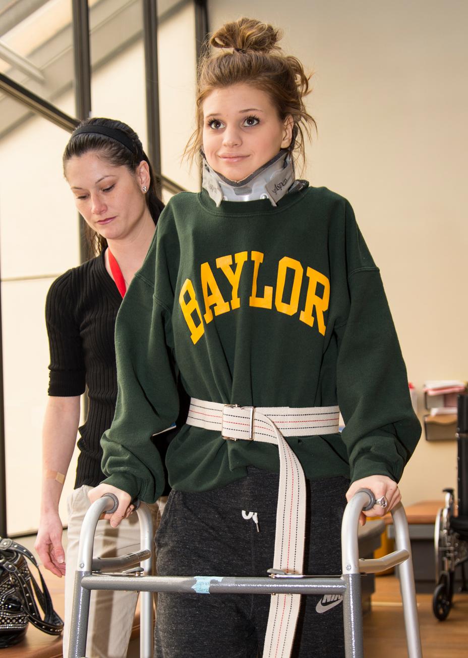 Makenzie Wethington was admitted to Baylor Institute for Rehabilitation in Dallas on January 31 after sustaining injuries during a skydiving accident. Photo: Makenzie during a physical therapy session on Feb. 3, 2014. The physical therapist in the photo is Christina Fazio, PT.