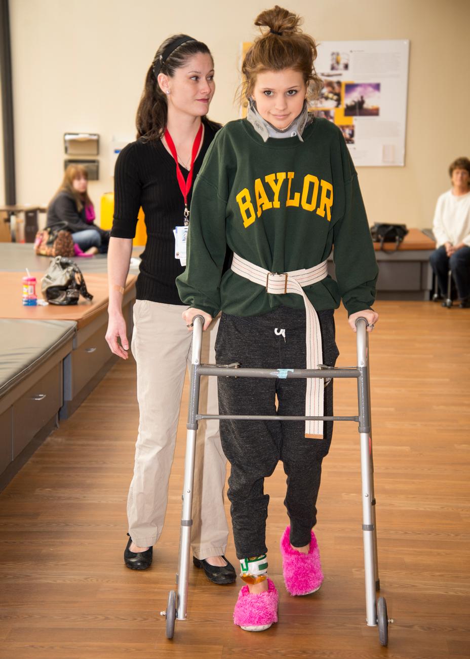 Makenzie Wethington was admitted to Baylor Institute for Rehabilitation in Dallas on January 31 after sustaining injuries during a skydiving accident. Photo: Makenzie during a physical therapy session on Feb. 3, 2014. The physical therapist in the photo is Christina Fazio, PT.
